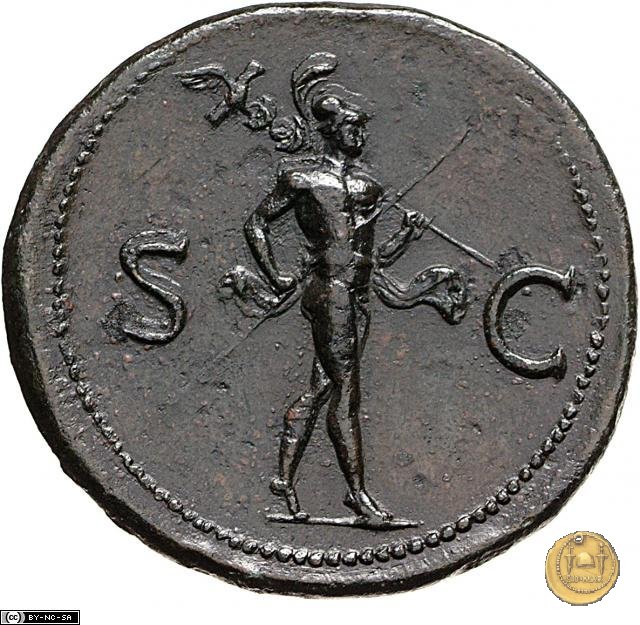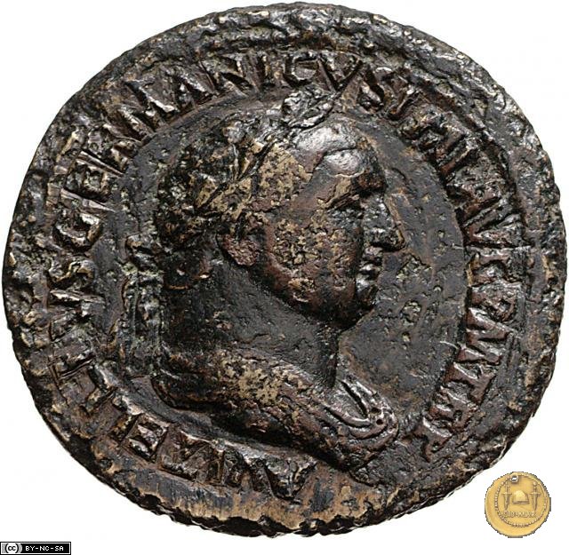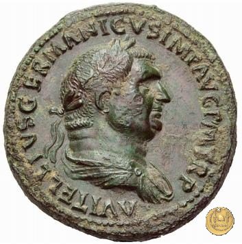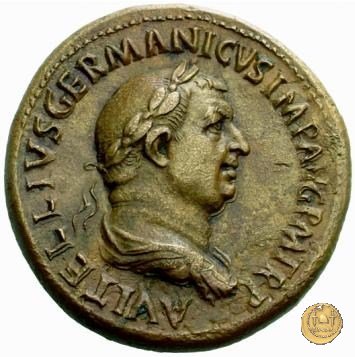 CLM145 Obverse: ↻ A VITELLIVS GER - M IMP AVG P M TR P Busto di Vitellio, laureato e drappeggiato, rivolto verso destra. Reverse: ![]() ANNONA ![]() AVG; → S C (esergo)Vitellio, con la testa nuda e in abbigliamento militare, in piedi verso destra; nella mano destra una lancia, nella sinistra un parazonium. Di fronte a lui Ceres, drappeggiata e seduta verso sinistra, con in mano una patera ed una torcia. Fra di loro, un altare illuminato. Dietro Ceres la prua di una nave. | |