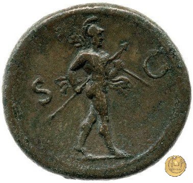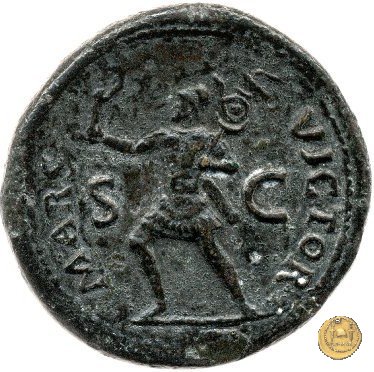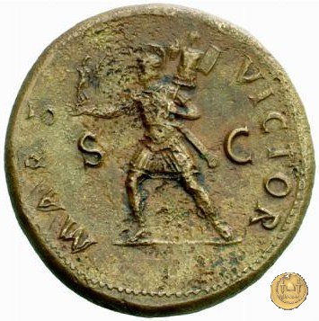CLM136 Obverse: ↻ A VITELLIVS GERMAN IM - P AVG P M TR P Busto di Vitellio, laureato e drappeggiato, rivolto verso destra. Reverse: → S - C Marte, elmato, nudo, ma con mantello, cammina verso destra. In mano, una lancia e un trofeo sulla spalla. | |