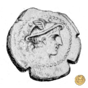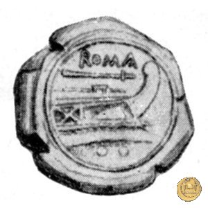 Disegno della moneta (conservata presso la Bibliothèque Nationale di Parigi) tratto da "Saggio di catalogo generale delle monete consolari anonime con simboli" di Santini Alberto, 1939.